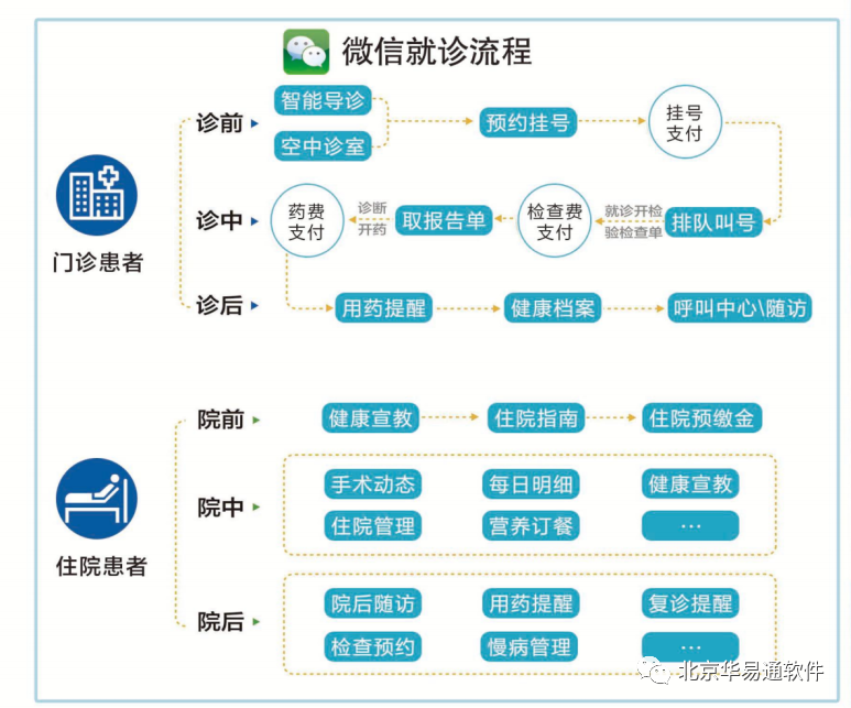华易通提供的“互联网+”微信公众医疗平台,能够实现“智能导诊、预约挂号、诊间支付、查看账单、查看检验检查报告等门诊信息流到资金流的全流程医疗服务。华易通平台将以往碎片化的服务内容加以整合,利用线上平台对患者在线下实体就医的流程进行优化,形成相对完整的微信就医服务模式。