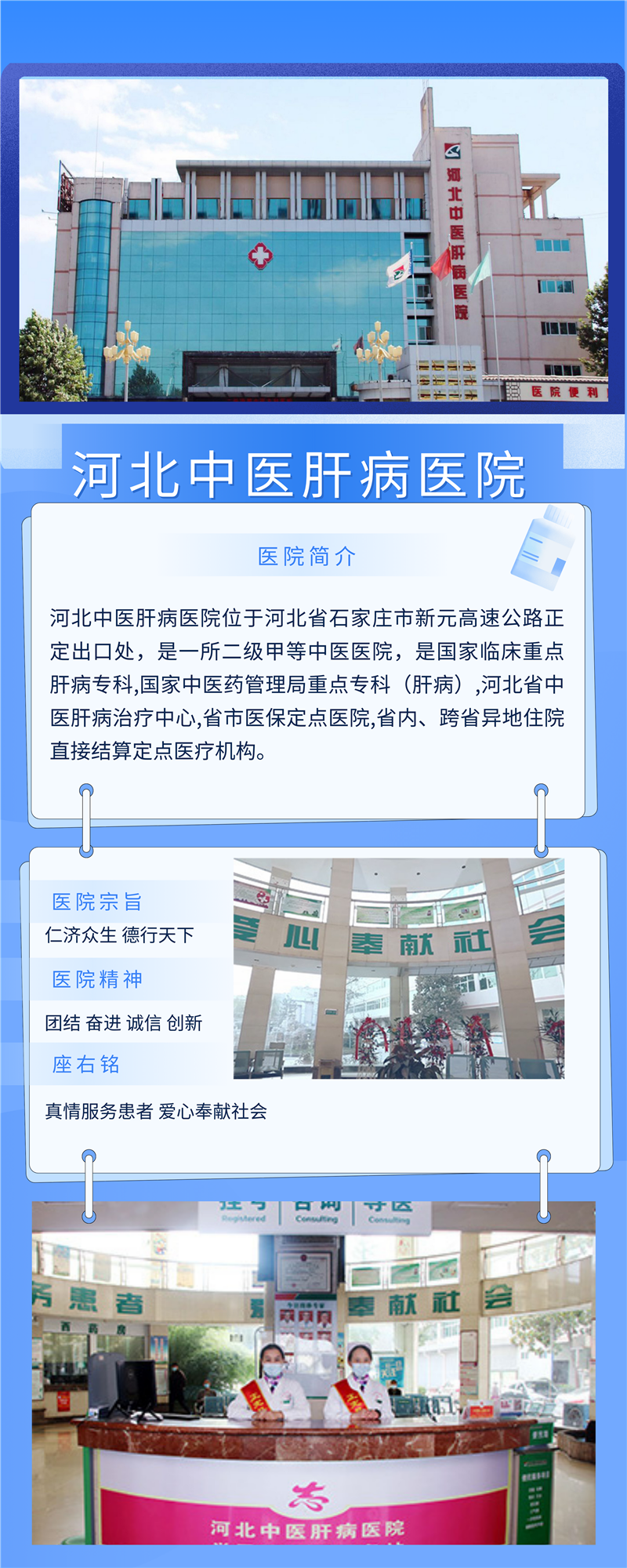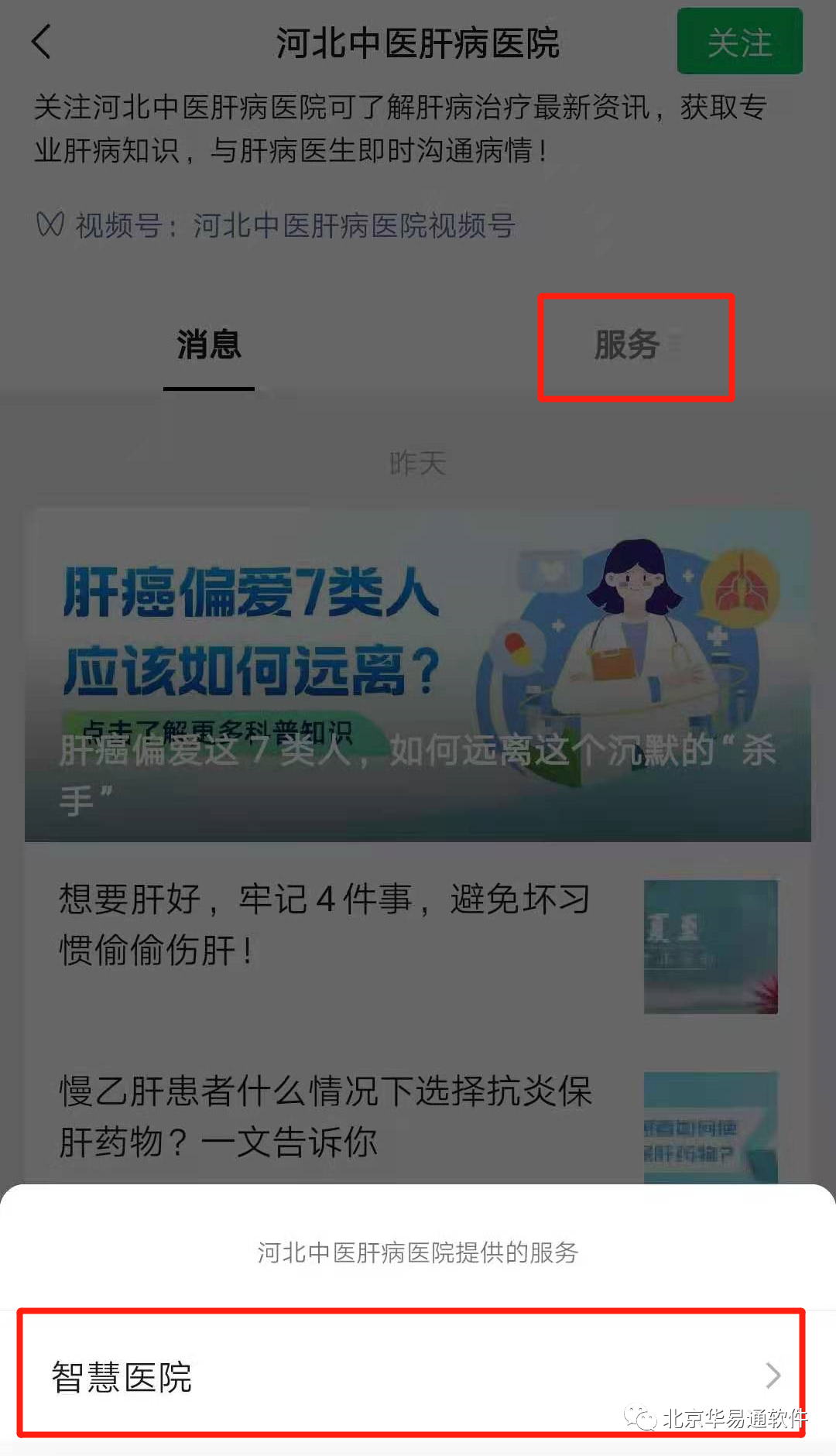华易通为河北中医肝病医院开发的微信公众号功能覆盖“诊前、诊中、诊后”各个环节,实现包括医院介绍、医生介绍、设备介绍、门诊挂号、检验报告查询、检查报告查询、体检报告查询、门诊费用查询、住院清单等多项服务功能。