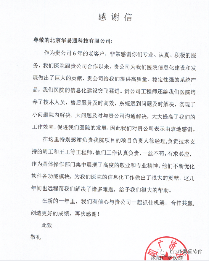 近日,沭阳广济医院致信北京华易通科技有限公司,高度赞赏了工程师团队在处理电子处方流转时的卓越表现。