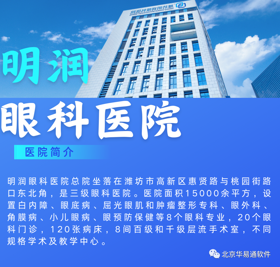 华易通为潍坊明润眼科医院提供整体智慧医疗解决方案,全面部署HIS、EMR、LIS、PACS等系统以及各外部接口,全面满足医院人、财、物的管理和信息互联互通。