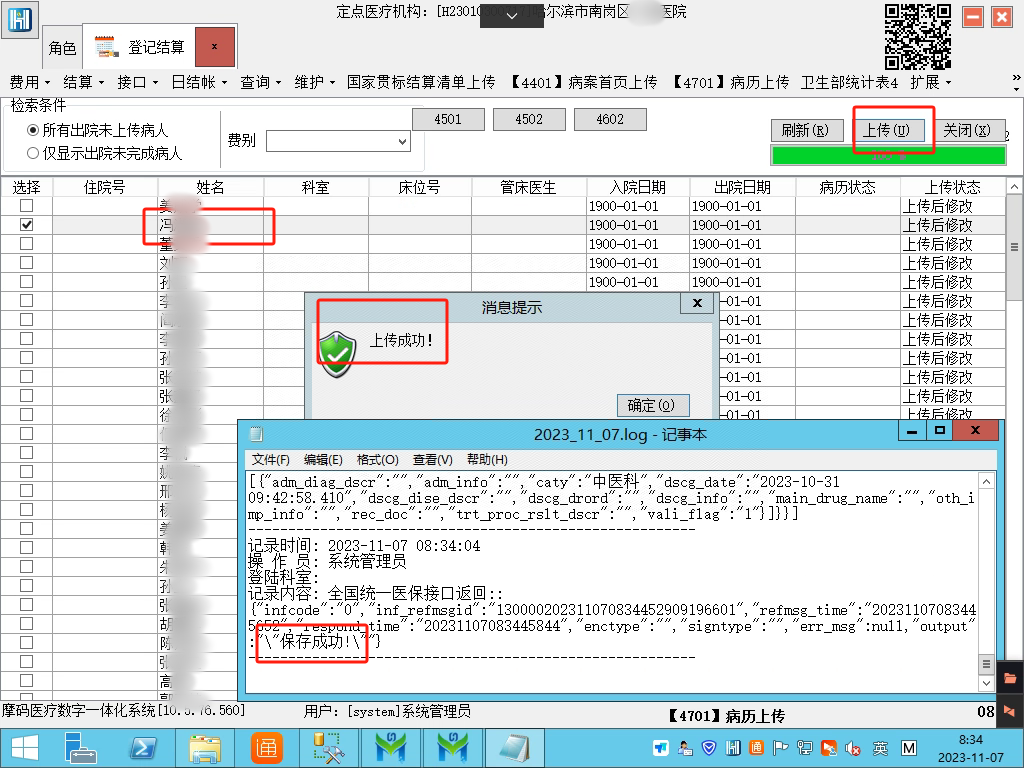 11月7日8时34分,经过紧张调试,黑龙江省哈尔滨市南岗区某医院通过省医保专线网络通讯传输,成功上传了黑龙江省第一本门诊电子病历,成为该省首家通过电子病历上传验收的医疗单位,也标志着黑龙江省医疗信息化建设迈出了具有里程碑意义的一步。