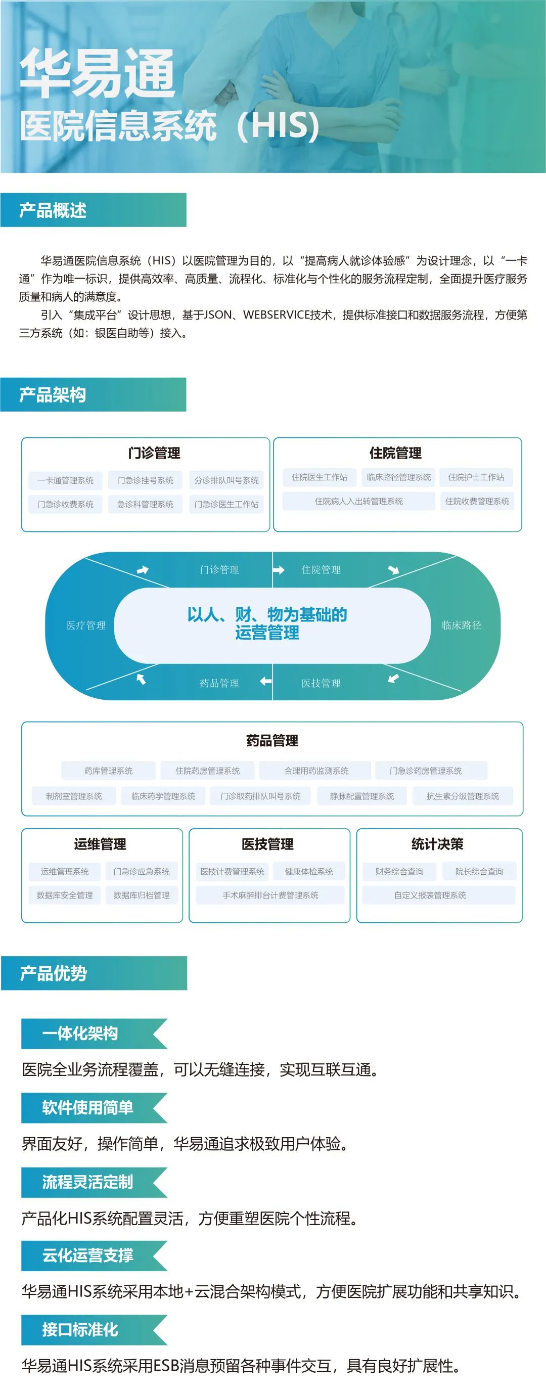 华易通科技,成立于2002年,是一家总部位于北京,在唐山、潍坊、哈尔滨、太原、长春、南京、沈阳设立分公司,辐射全国的高新技术企业和双软企业。公司专注于医疗信息化事业20余年,是集软件设计、研发、销售、培训和服务于一体的智慧医疗整体解决方案提供商。