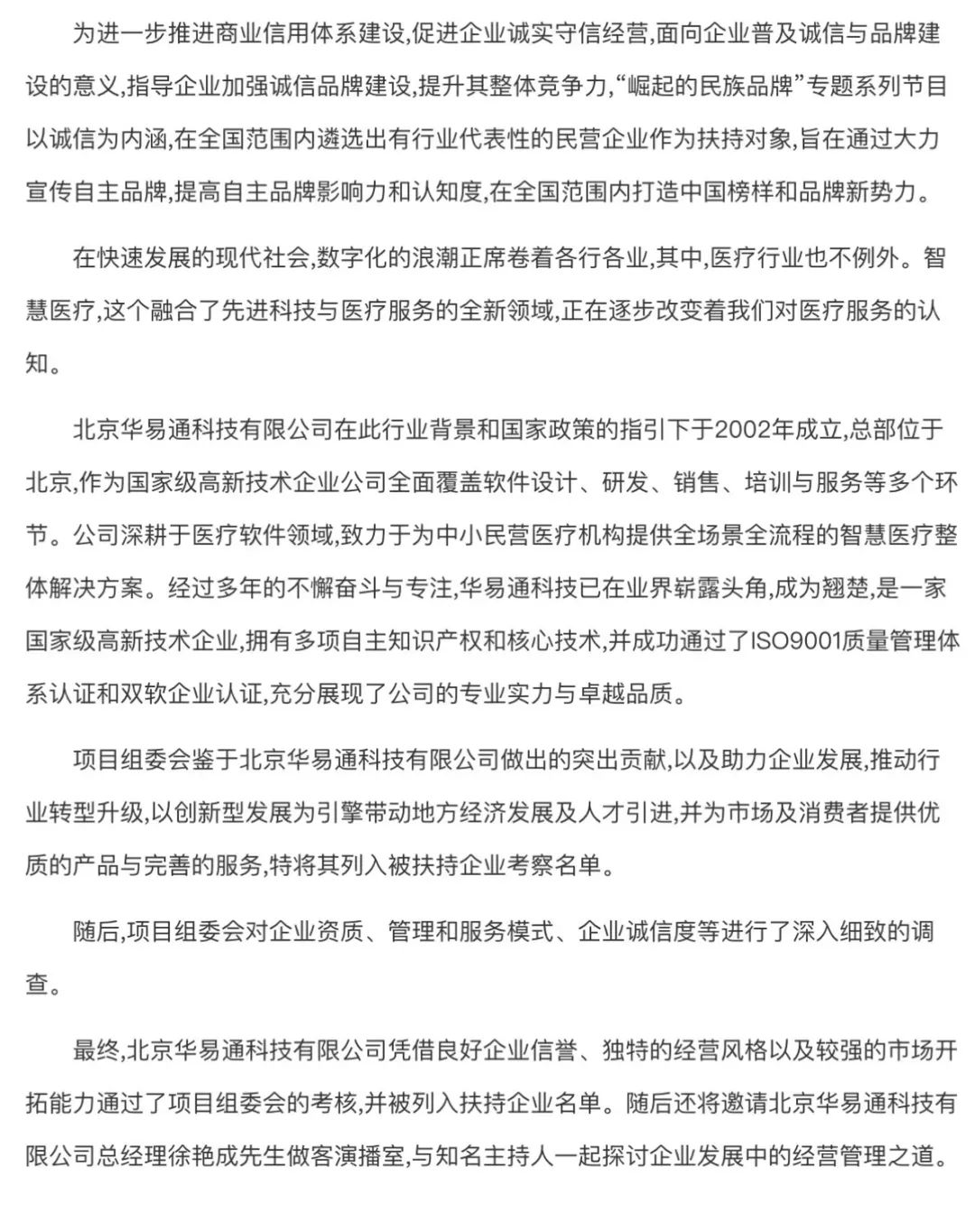 近日,北京华易通科技有限公司(以下简称“华易通科技”)传来喜讯,公司总经理徐艳成先生受邀参与央视《信用中国》节目的录制,与知名主持人董倩共同就企业发展中的经营管理和信用建设进行深入探讨。华易通科技的受邀参加也引起了众多媒体的关注。中国网、中华网、新浪网、信息新报、科技世界网、健康在线、北京在线、首都热线、企业家日报网和聚合网等各大媒体网站纷纷进行报道,并对节目内容表示高度期待。