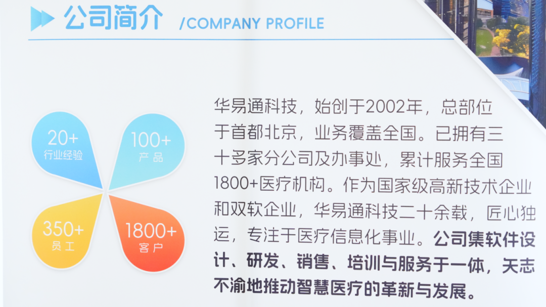 华易通科技,始创于2002年,总部位于首都北京,业务覆盖全国。已拥有三十多家分公司及办事处,累计服务全国1800+医疗机构。作为国家级高新技术企业和双软企业,华易通科技二十余载,匠心独运,专注于医疗信息化事业。公司集软件设计、研发、销售、培训与服务于一体,矢志不渝地推动智慧医疗的革新与发展。